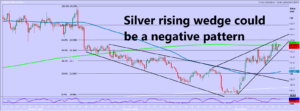 A rising wedge is characterized by upward-sloping support and resistance lines that converge. This pattern suggests a weakening upward trend and potential reversal to the downside.